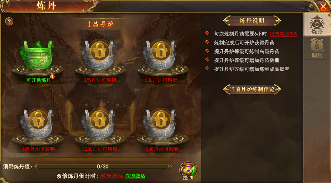 丹方调制:多余丹方可进行调制,概率获得其他丹方或成品丹药。