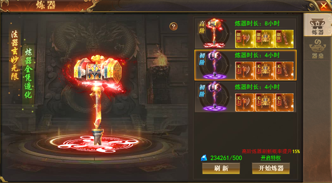 每次炼器完成可免费刷新一次炼器级别(可消耗钻石刷新)。