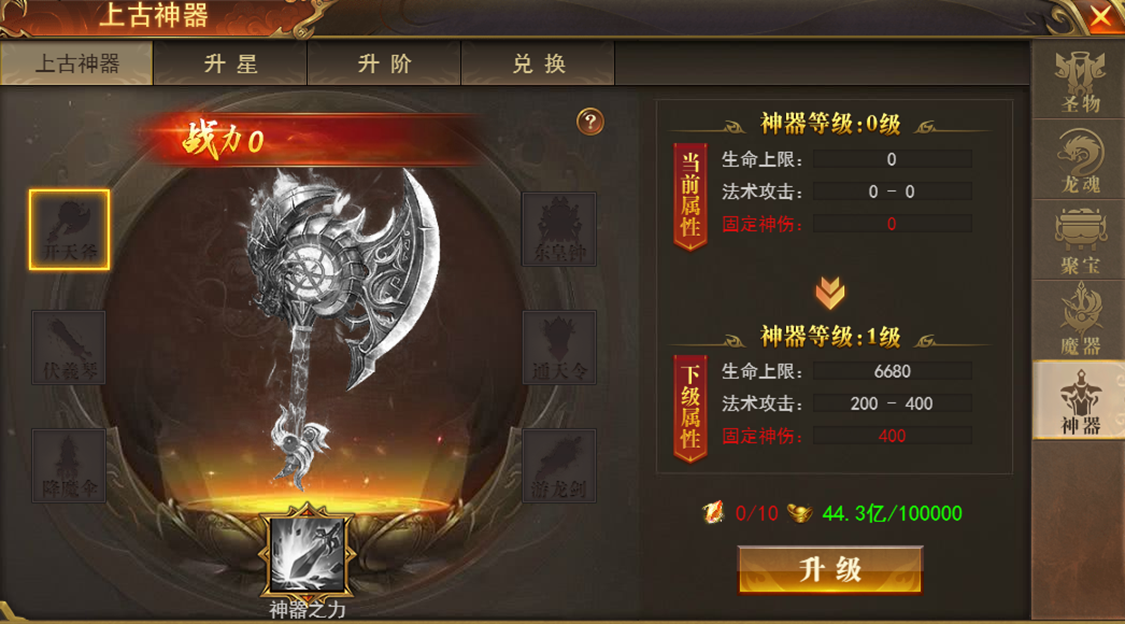 消耗上古神石(洞府炼器产出)提升神器等级可获得基础属性;