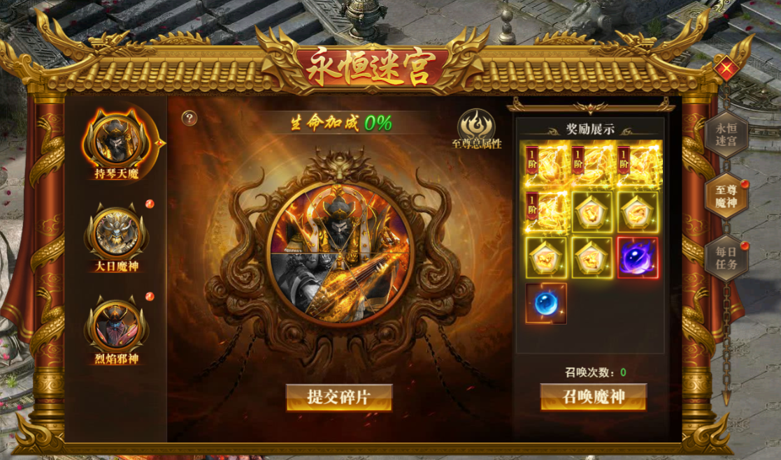 魔神共3个,每个魔神具用6个基础部位,提交对应部位碎片可提升部位等级,每6个部位等级+1可召唤魔神,击杀魔神可获得大量极品奖励(每个魔神每日上限20次)。